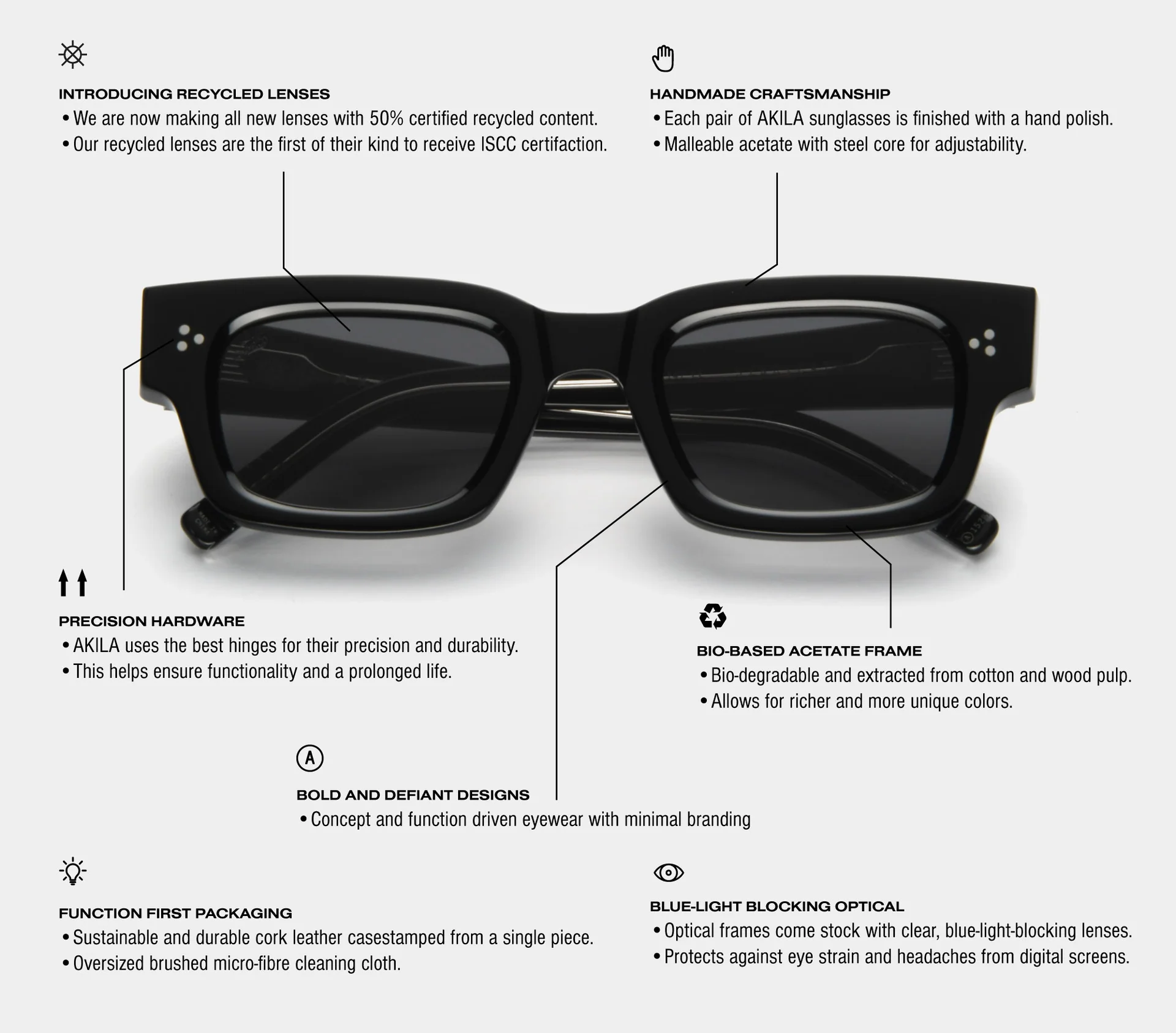 Akila is an independent eyewear brand that has built a reputation for producing handmade, limited-run sunglasses that combine durability, comfort, and style. Every pair of Akila sunglasses is designed in Los Angeles and constructed with eco-friendly acetate and optical-grade recycled lenses. Their commitment to sustainability is matched only by their dedication to craftsmanship, with each frame featuring stainless steel cores for added longevity. Akila’s designs are not just functional but also a statement of art, blending innovative design with a commitment to environmental responsibility.
