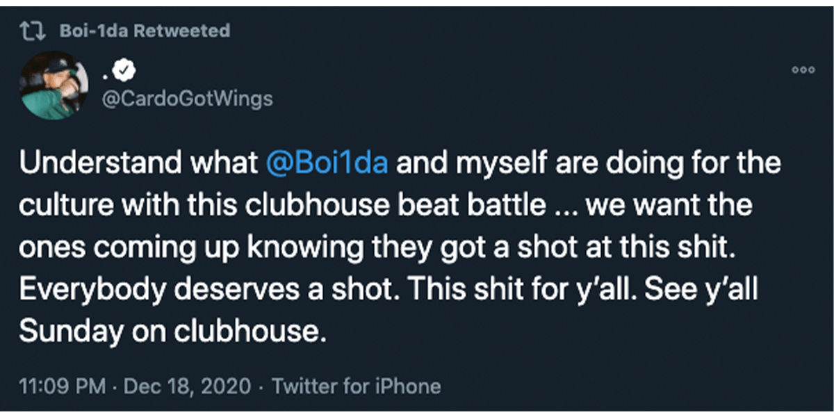 The fourth Clubhouse Beat Battle happened last month. Clubhouse chats aren’t recorded, so the battles are one-time-only moments, like listening to the radio. In order to stay with it, A&Rs, label execs, songwriters, and tastemakers have been packing the rooms to keep an eye on undiscovered talent. It’s like an American Idol for producers.