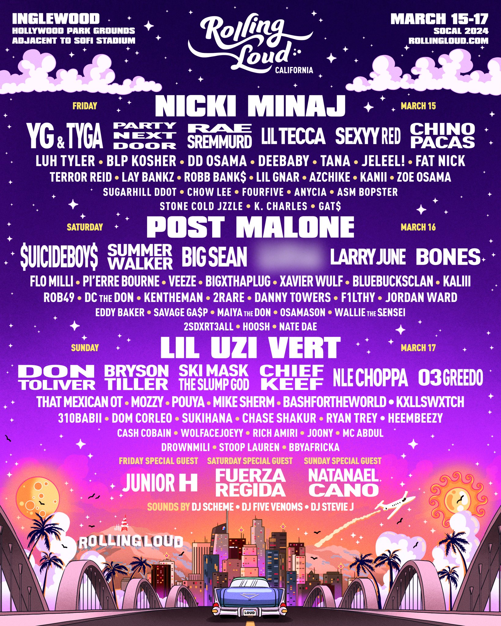 The first day of the festival is set to see performances from YG & Tyga, PARTYNEXTDOOR, Rae Sremmurd, Lil Tecca, Sexyy Red, Chino Pacas, and many more before getting to the headliner. Nicki Minaj is set to headline on Friday, March 15th and close out Rolling Loud’s first night of 2024. Saturday, March 16th will see performances from $UICIDEBOY$, Summer Walker, Big Sean, Larry June, Bones and more before Post Malone hits the stage to close out the evening. The final day of the festival, Sunday, March 17th will host Don Toliver, Bryson Tiller, Ski Mask the Slump God, Chief Keef, NLE Choppa, O3Greedo and many more.
