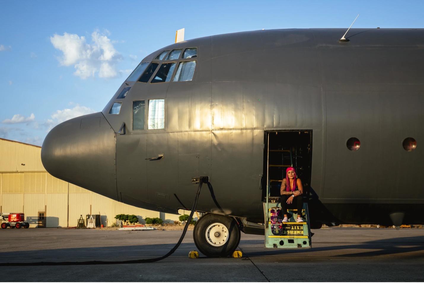 Leticia hopped on board a C-130 Hercules, the same airplane used in the Fast & Furious movie franchise, armed with a parachute of almost 20 pounds (9.1 kg) and her skateboard, before grinding out of the back while it was in flight.