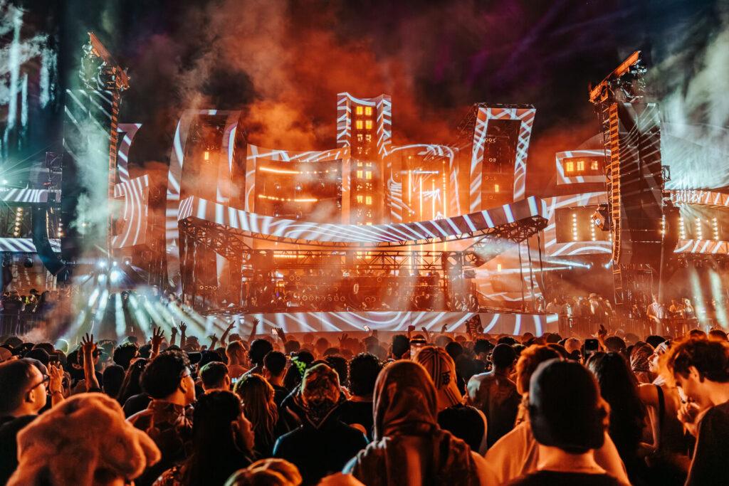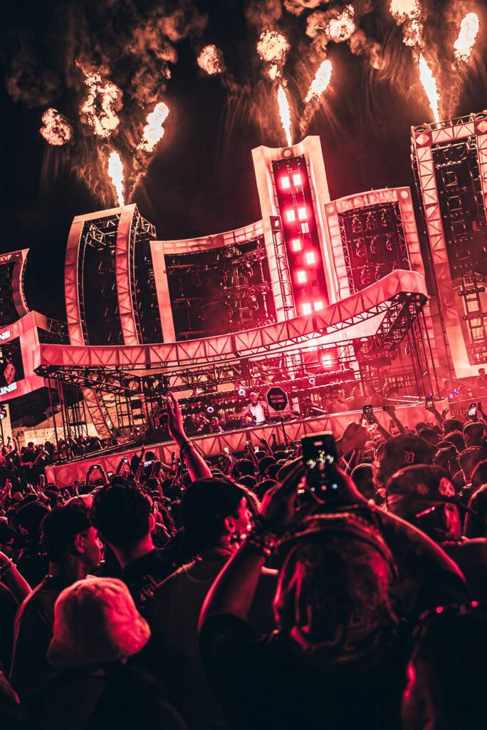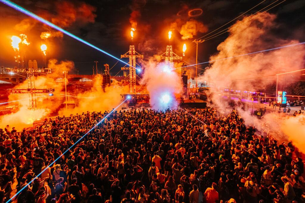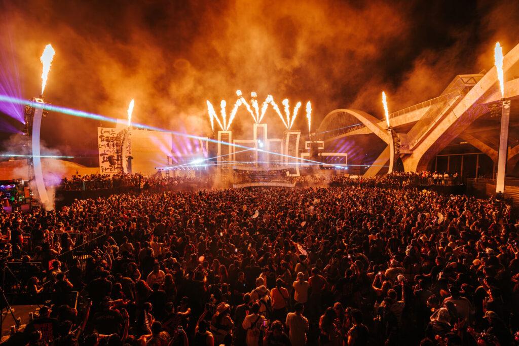 Walking straight from the entrance guided you to the East Side stage—technically the main stage. The large dancefloor with the grandeur of the Sixth Street Viaduct to our right—where moving graphics were constantly projected against the bridge in sync with the beat—made it one of the coolest sights you could ask for. It felt like a genuine underground party, or a party under the bridge if you want to call it that. The constant laser shows and never-ending pyro felt like they were dancing with the fans, lifting the experience to another level.