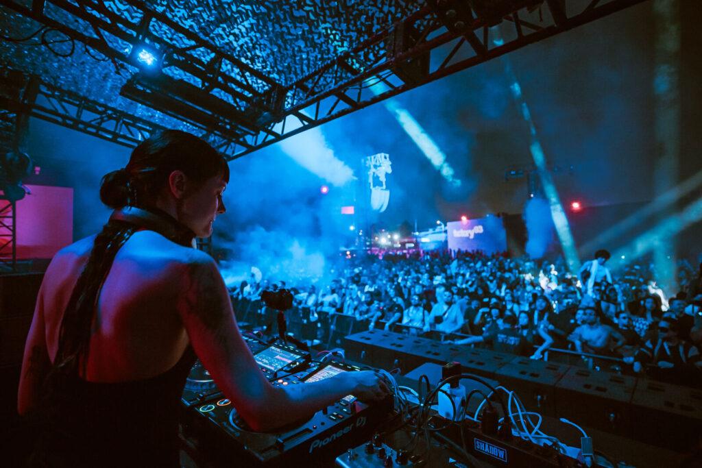 As fans entered the venue, they were greeted by the West Side stage, where the bass and pyros could be heard from a mile away. This stage—graced by hard-hitting artists like Joseph Capriati to 999999999 (I hope I counted the 9’s correctly)—had one of the most unique set designs I’ve ever seen. At first glance, it looked like an “unfinished” stage, like they had little time to set it up. But after a closer look, the stage had this bonkers, don’t-care-attitude design—basically several electrical power poles with “wires” that were actually light shows and strobe lights, all connected to a central “power grid” that shot lasers and pyrotechnics in every direction. It looked like no thought was given, but was actually brilliantly designed.