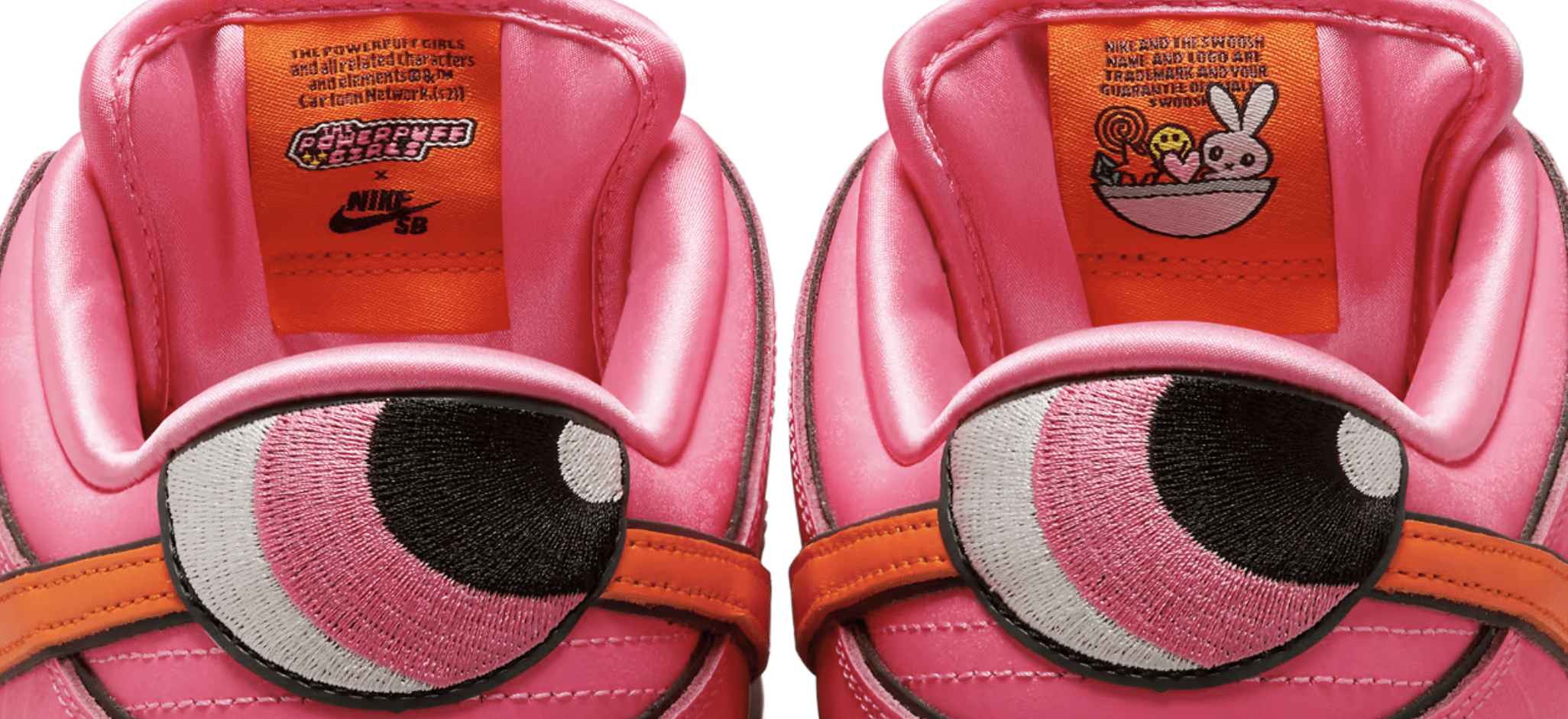 The “Blossom” Dunk Lows come in a bright pink, to match their Powerpuff Girl inspiration, with orange laces and Swooshes all tied together with black lining accents. The new Nike SB logo patch on the outside of the shoe’s tongues reads “Blossom,” while the inside label shows a bowl of “everything nice” that went into the creation of the shoes.