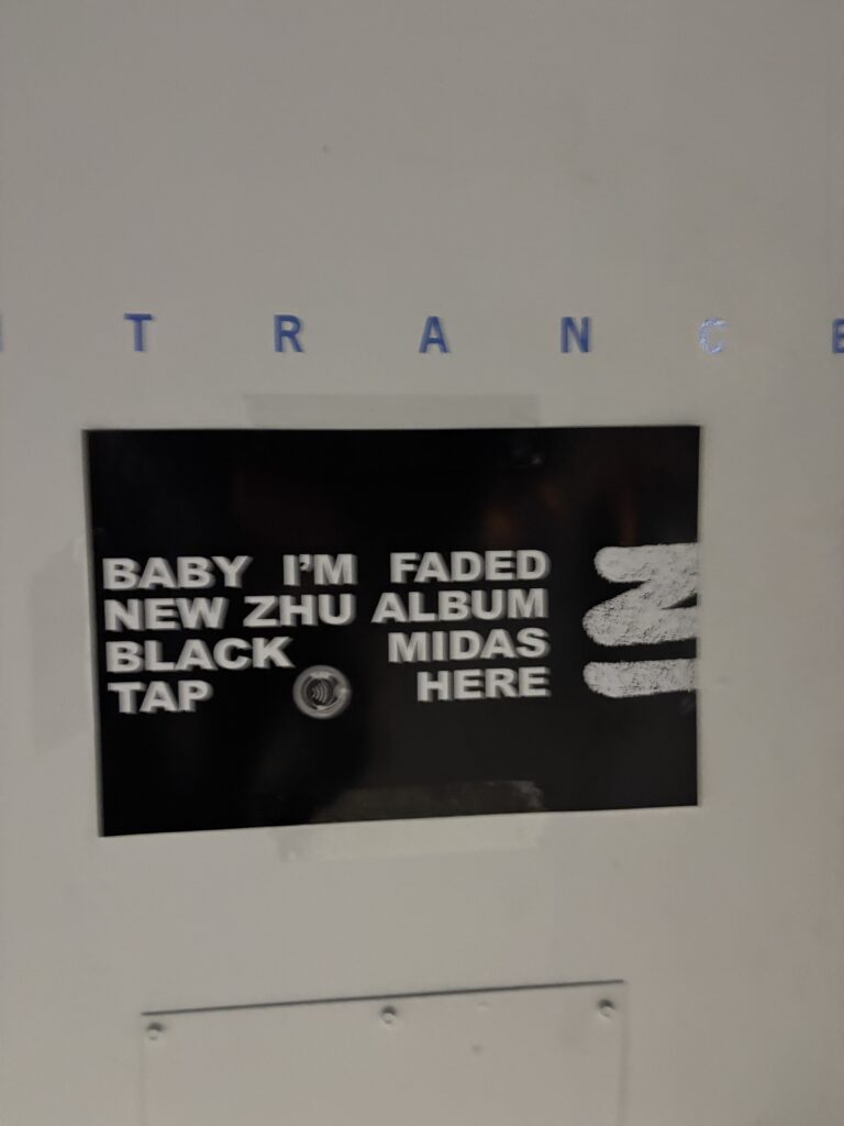 At the entrance, a small sign greeted everyone: “BABY I’M FADED — NEW ZHU ALBUM BLACK MIDAS — TAP HERE,” with a Spotify NFC tag underneath. A wink to the song that started it all, and a soft launch for the one that’s now closing the loop.