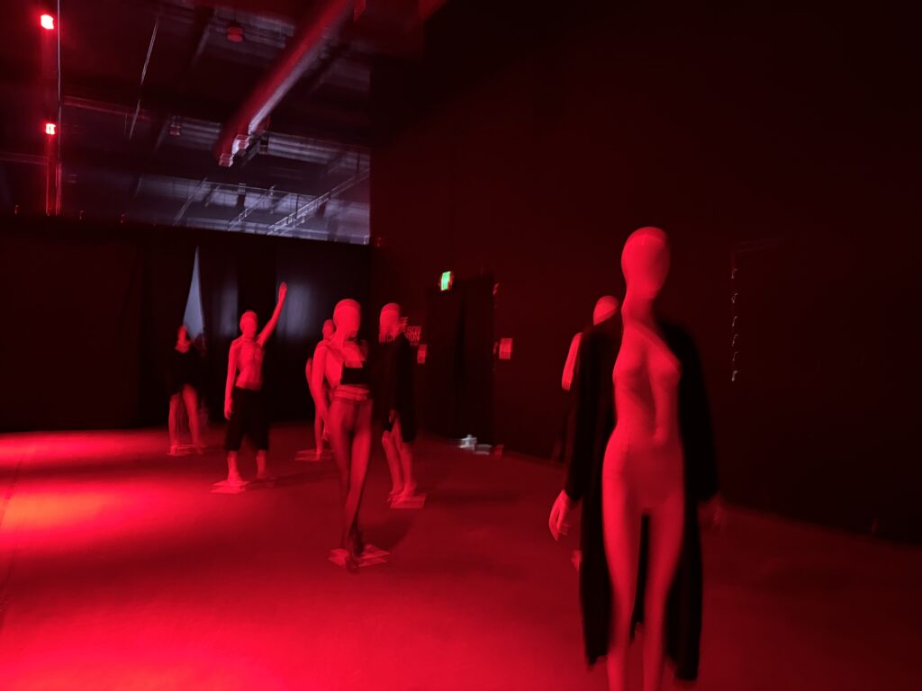 The mannequin installation from ZHU’s 2026 Ultra Music Festival production was reassembled inside the Sherman Way space, washed in red light.
